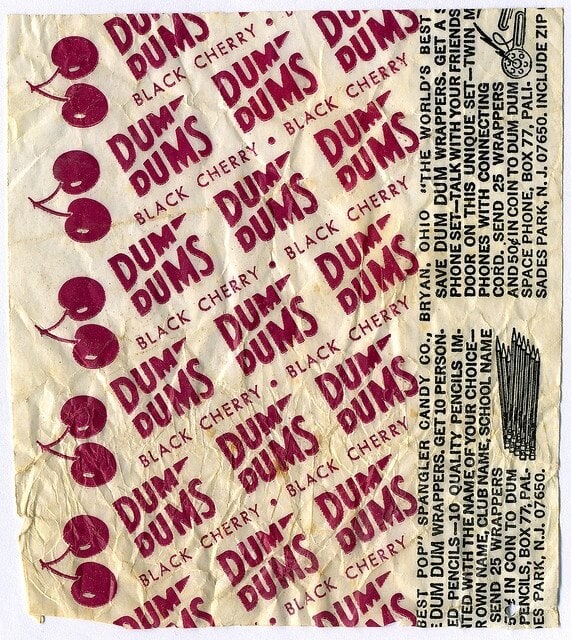 Dum-Dums had that wonderful pattern repetition of the logo printed over and over around the lollipop wrappers, which held great value! Save them, send in with a coin or two, and a novelty item would arrive in the post. The tactile stack of waxy papers covering the sweets felt like a wad of cash in a kid’s hands.